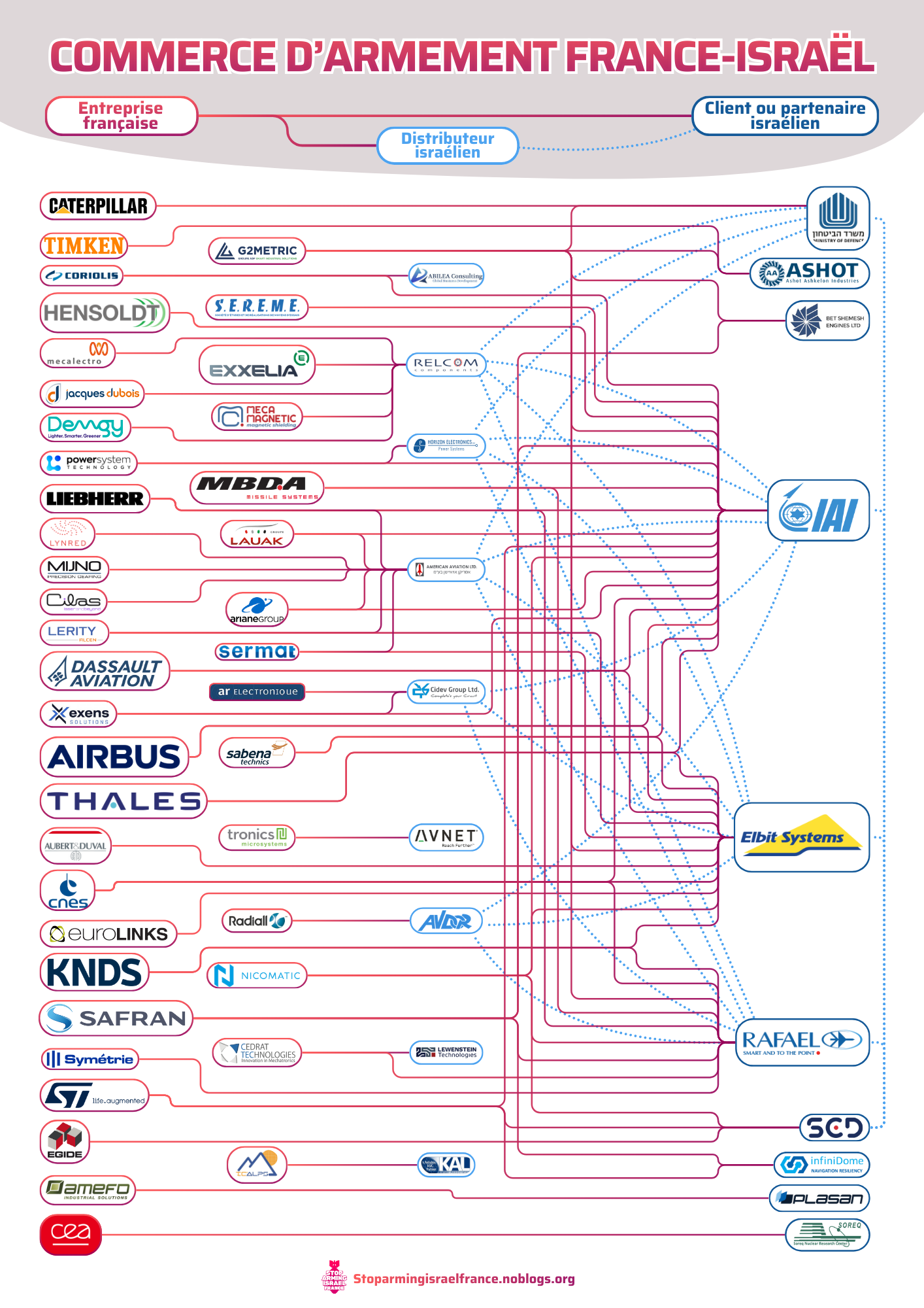 Est-il possible de synthétiser l’ensemble de nos recherches sur le commerce d’armement entre la France et Israël en une image ? C’est ce que nous avons essayé de faire avec ce graphe, publié dans notre Guide des entreprises françaises d’armement complices d’Israël. Il est clair que bien des informations manquent dans ce support visuel : domaines d’activité de chaque entreprise, temporalité et intensité des relations avec les entités israéliennes, nature exacte des liens indiqués – ventes de composants, coopérations technologiques, aide à l’importation… Autant de détails que chacun·e peut retrouver dans les fiches dédiées à chaque entreprises contenues dans le Guide.