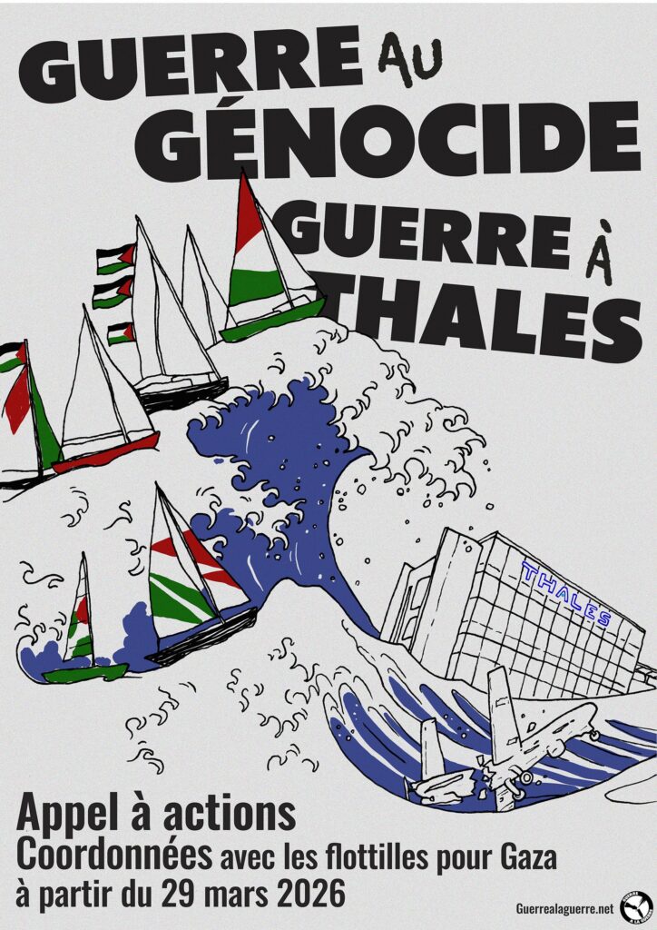 Dans le cadre de la campagne au long court Guerre à Thales, guerre à la guerre, la coalition Guerre à la guerre lance aujourd’hui un appel à actions coordonnées avec les prochaines flottilles pour Gaza, dont le départ est prévu le 29 mars 2026.