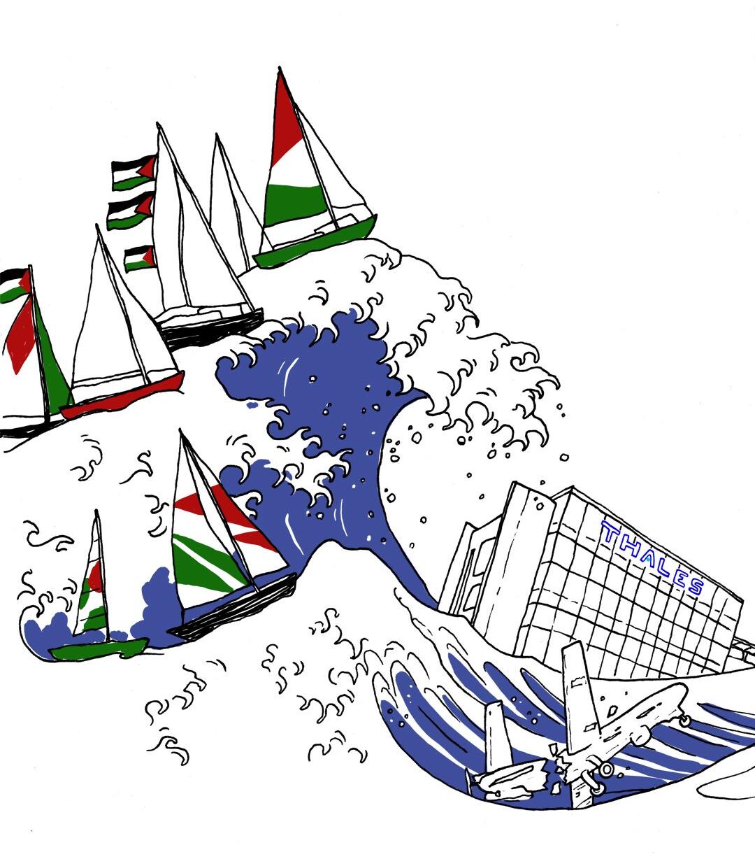 À l’instant où les flottilles prendront la mer, nous agirons avec elles, pour rompre l’impunité de ceux qui profitent des guerres impérialistes et de l’oppression du peuple palestinien. En ciblant Thales, nous appelons à diriger nos efforts, ici même, contre le soutien matériel que la France apporte à la colonisation, à l’apartheid et au génocide en Palestine. Soyons les grains de sable qui feront s’enrayer la machine impériale !