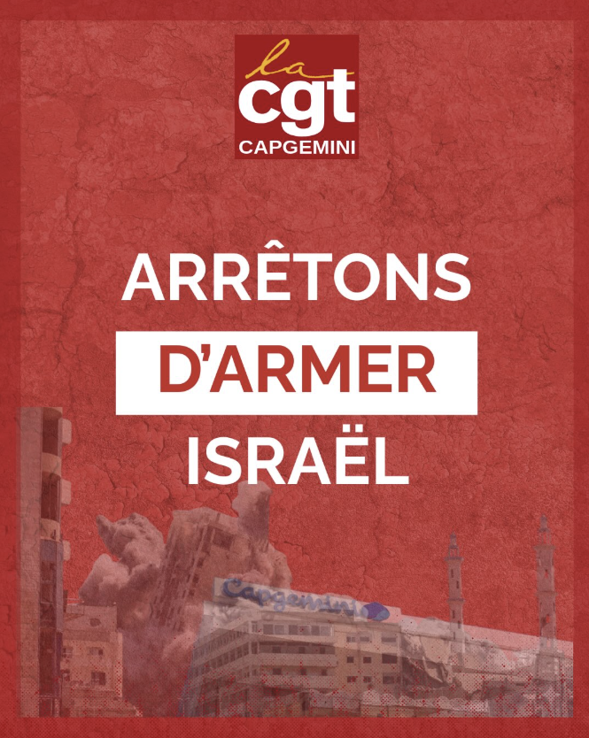 Le 12 décembre 2025, la CGT Capgemini publie un article pour dénoncer le commerce d’armement avec Israël et les contrats que Capgemini entretient avec les entreprises d’armement complices. Elle revendique le droit à une clause de conscience pour permettre aux salarié·es de refuser de travailler pour des clients militaires. Nous reproduisons ici l’article issu de son site internet.