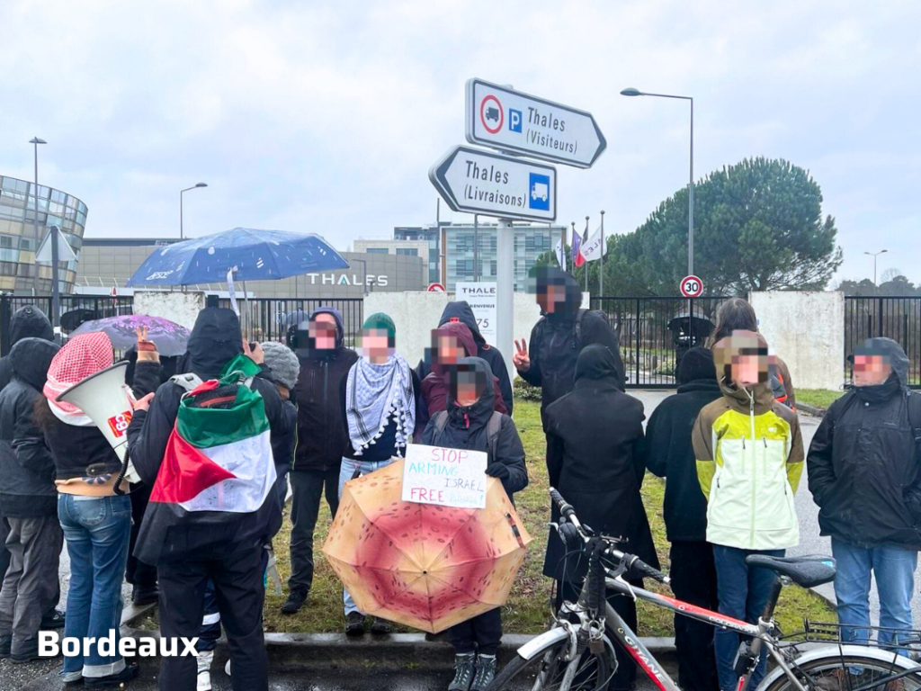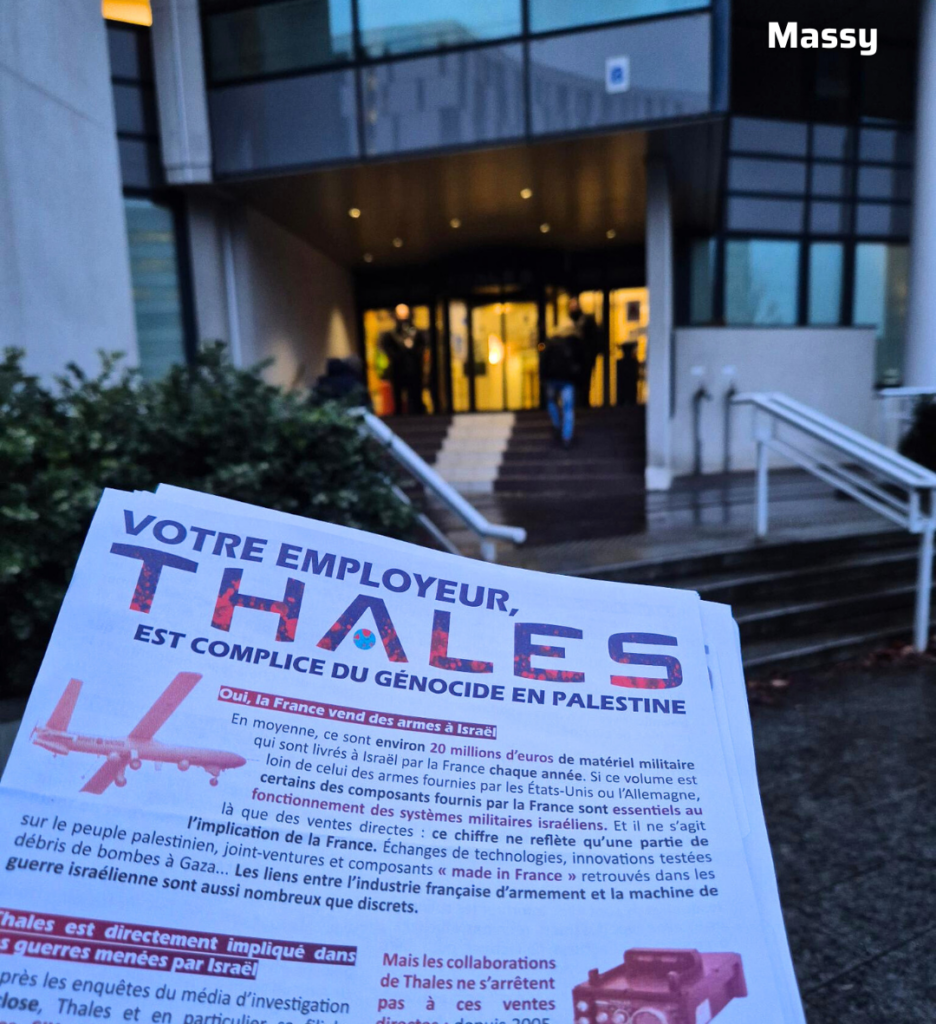 Thales est de loin celle qui a reçu le plus d’attention, avec des tractages, rassemblements et collages à Toulouse, Vendôme, Lyon, Bordeaux, Pont-Audemer, Massy, Élancourt, Gennevilliers, et Rungis.
