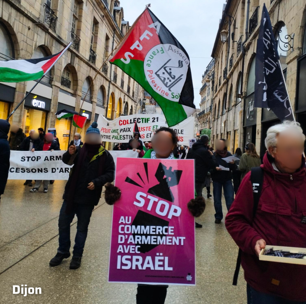 Des manifestations et rassemblements ont également visibilisé la campagne Stop Arming Israel dans les centre-ville de Dijon, le Mans, Caen, Niort, Dignes-les-Bains et Brest.