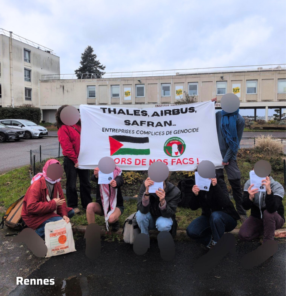 Ce sont également des tractages, collages, et stands d’infos qui se sont multipliés dans les lieux d’études d’Orléans, Caen, Strasbourg et Rennes pour dénoncer les liens entre les entreprises d’armement et l’enseignement supérieur.